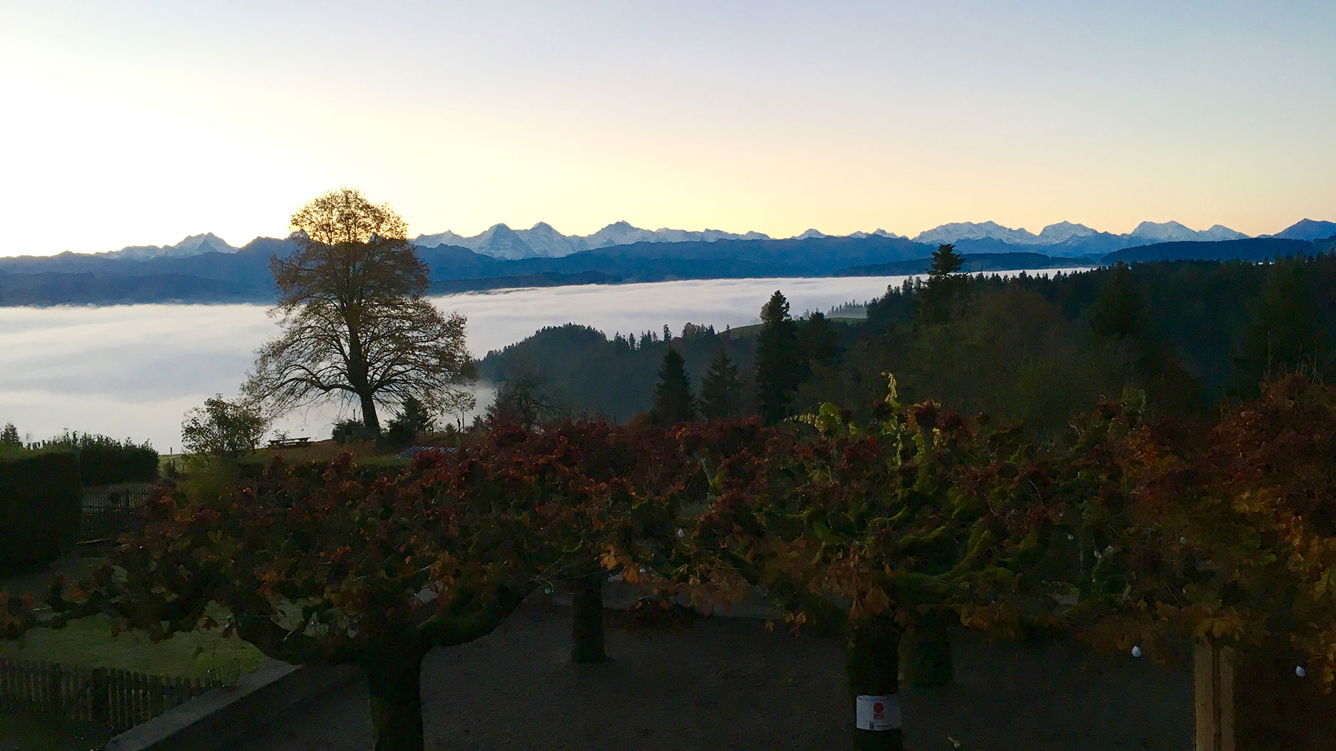 Sie sitzen unter Schatten spendenden Kastanienbäumen in unserer lauschigen Gartenwirtschaft. Und vor Ihnen liegen die traumhafte Hügellandschaft des Emmentals und die gewaltige Berner Alpenwelt.